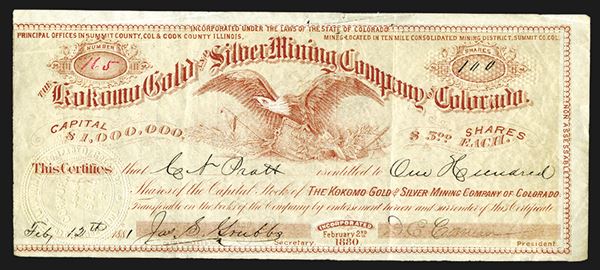 Offices in Summit County, Colorado & Cook County, Illinois. Mines located in ten Mile Consolidated Mining District, Summit County. 100 shares, brown on tan underprint, glorious eagle and shield, VF with some minor edge splits and pinholes. Scarce and desirable.