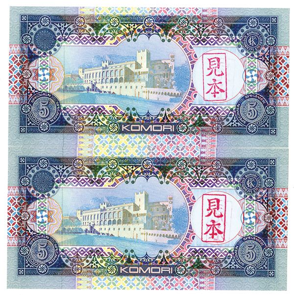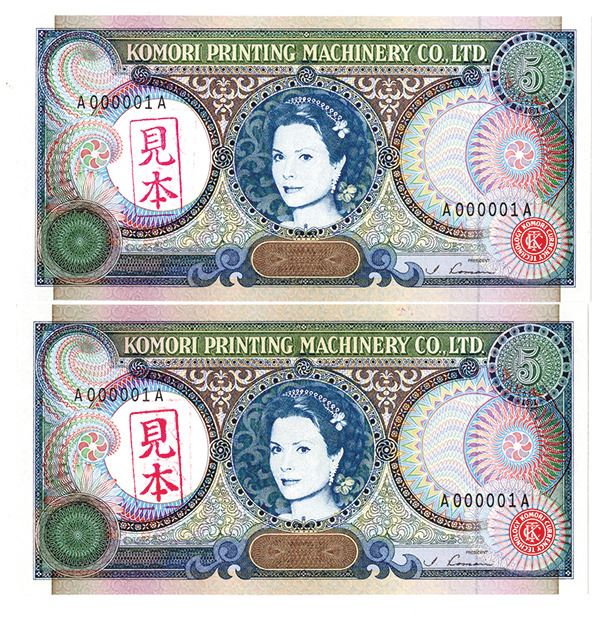 Japan. Lot includes a pair of multicolor advertising notes with "5" denomination, numerous ornamental and decorative guilloches, watermark at left, woman facing at center, reverse features a historic castle or fort. S/N A00001A. Choice Unc. (2)