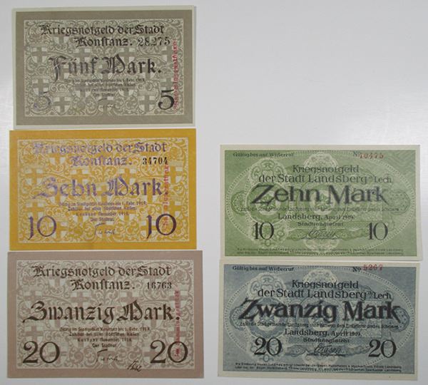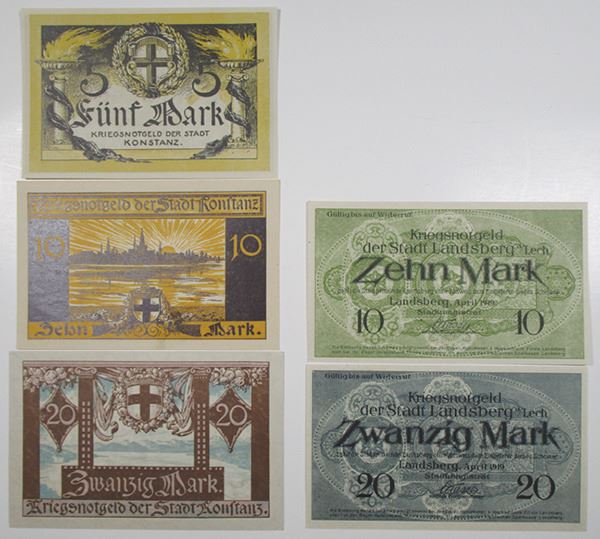 Germany. 1918-19, Lot includes from Konstanz a 1918 trio of 5, 10, and 20 Mark war Notgeld; and from Landsberg a 1919 pair of 10 and 20 Mark war Notgeld. About to Choice Unc. (5)