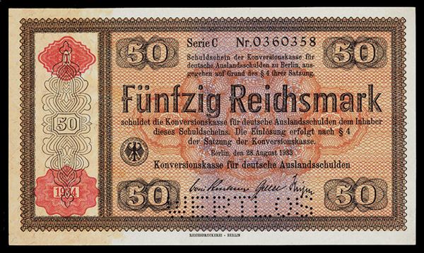 Germany. Aug. 28, 1933 1934 overprint), 50 Reichsmark, P-211, overprint on P-203, red guilloches , left. PMG graded Choice Extremely Fine 45, EPQ (Exceptional Paper Quality), Pin Punch WERTLOS overprint on bottom.