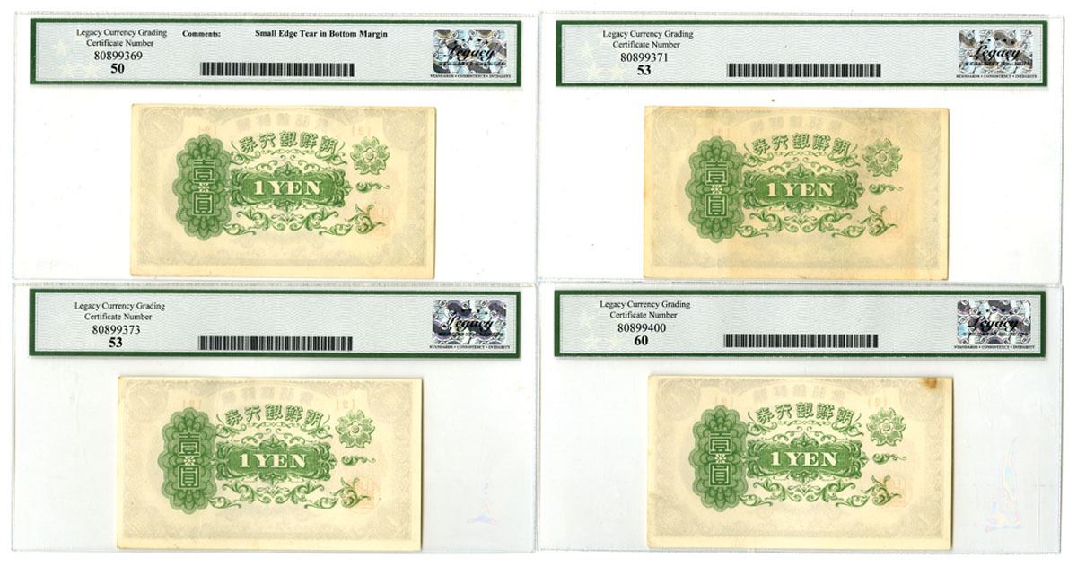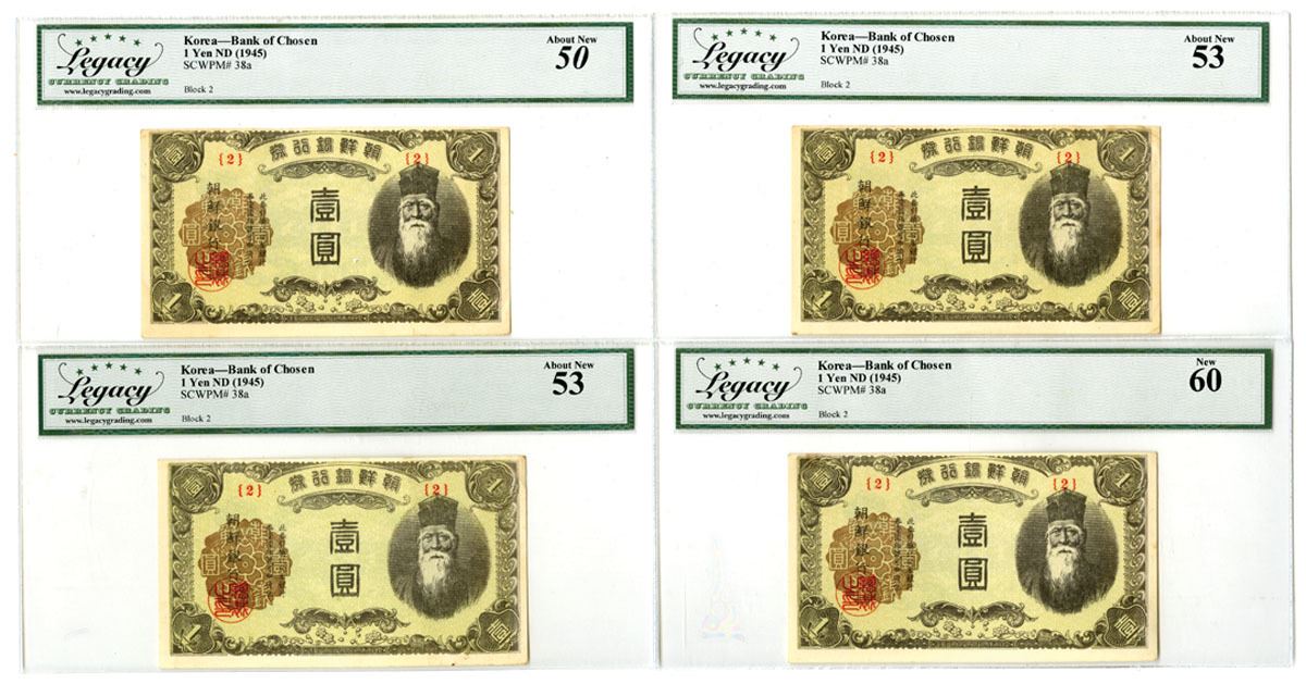 Korea, ND (1945). 1 Yen, P-38a (4), Issued Banknote Quartet, Black on pale green and brown underprint, Guilloche at left and man with beard at right, Back is green, All are Block 2, Notes are Legacy graded: from Lowest to Highest: About New 50 with comment "Small Edge Tear in Bottom Margin;" About New 53 (2); New 60. 94). Sold "AS IS" no returns accepted.