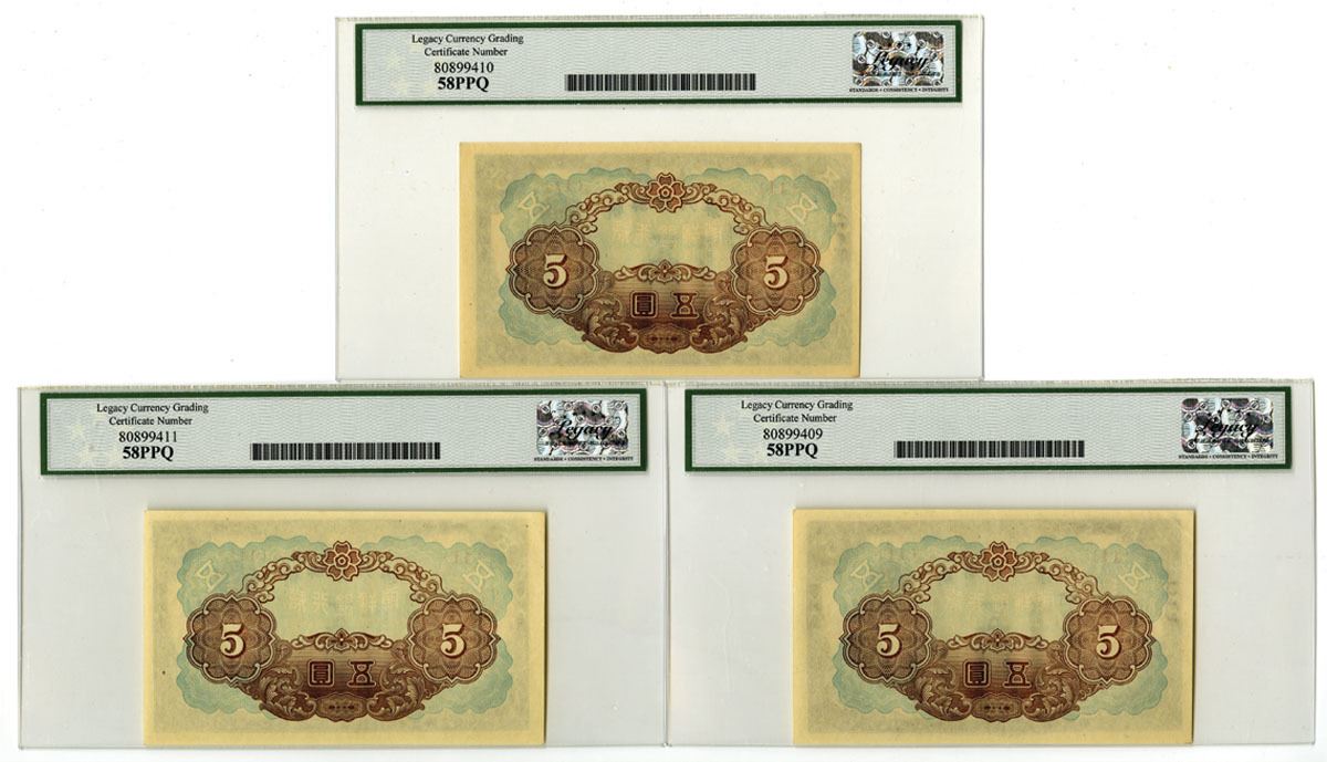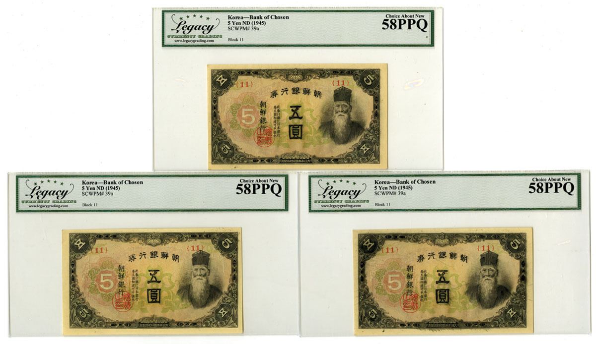 Korea, ND (1945). 5 Yen, P-39a (3), Issued Banknote Trio, Black on light brown green and lilac underprint, Man with beard at right, Back is brown with blue, All are Block 11 and are Legacy graded Choice About New 58PPQ. (3). Sold "AS IS" no returns accepted.