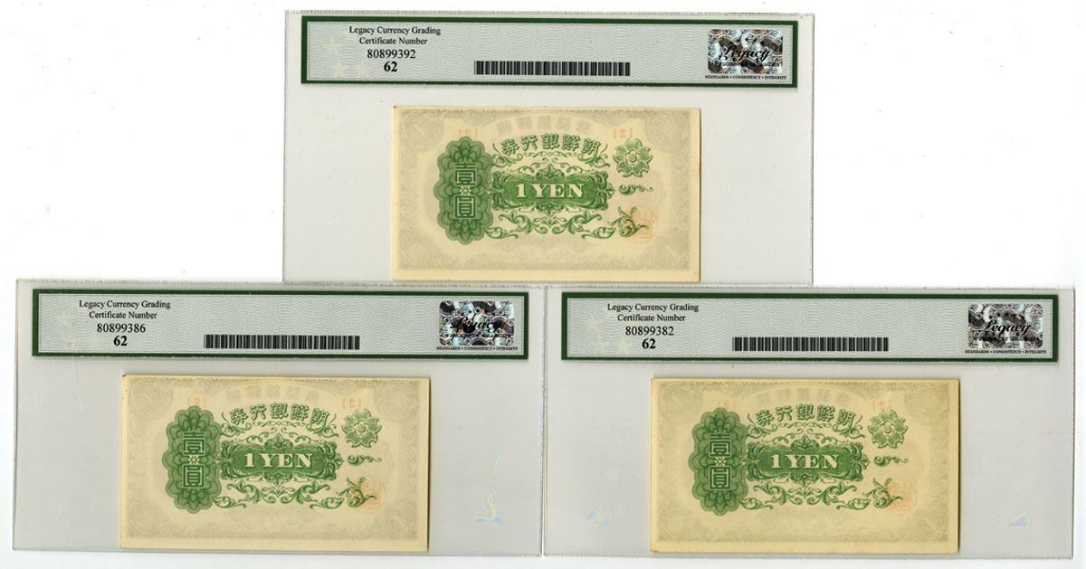 Korea, ND (1945). 1 Yen, P-38a (3), Issued Banknote Trio, Black on pale green and brown underprint, Guilloche at left and man with beard at right, Back is green, All are Block 2 and are Legacy graded New 62. (3). Sold "AS IS" no returns accepted.