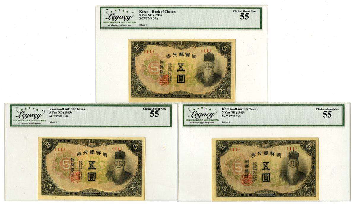 Korea..., ND (1945). 5 Yen, P-39a (3), Issued Banknote Trio, Black on light brown green and lilac underprint, Man with beard at right, Back is brown with blue, All are Block 11 and are Legacy graded Choice About New 55. (3). Sold "AS IS" no returns accepted.