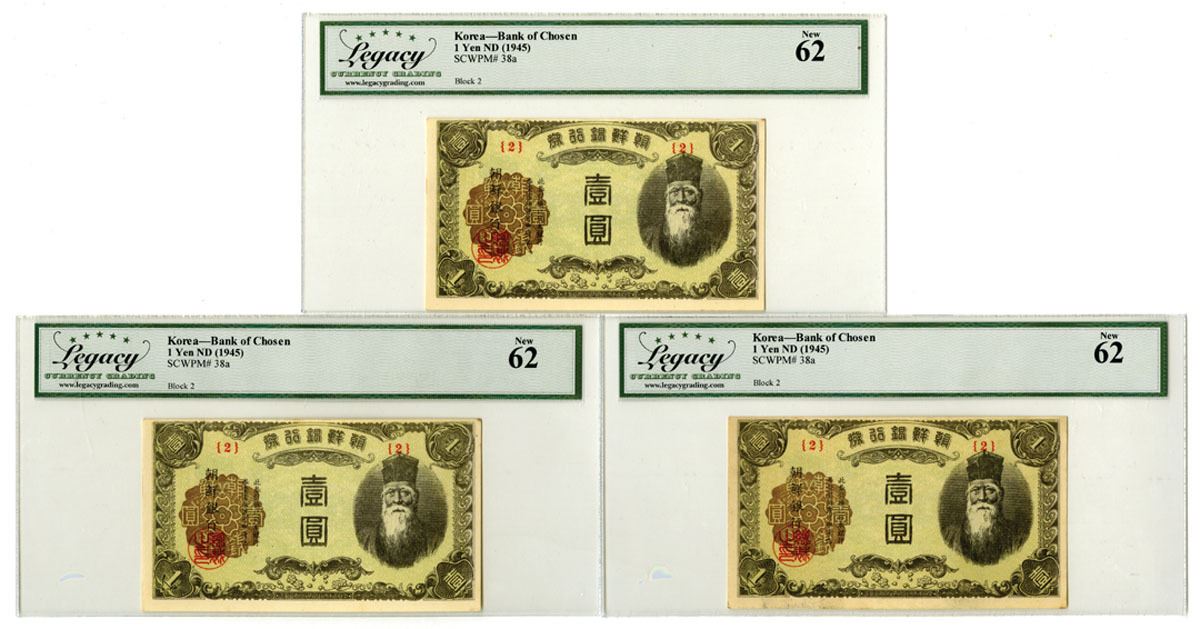 Korea, ND (1945). 1 Yen, P-38a (3), Issued Banknote Trio, Black on pale green and brown underprint, Guilloche at left and man with beard at right, Back is green, All are Block 2 and are Legacy graded New 62. (3). Sold "AS IS" no returns accepted.