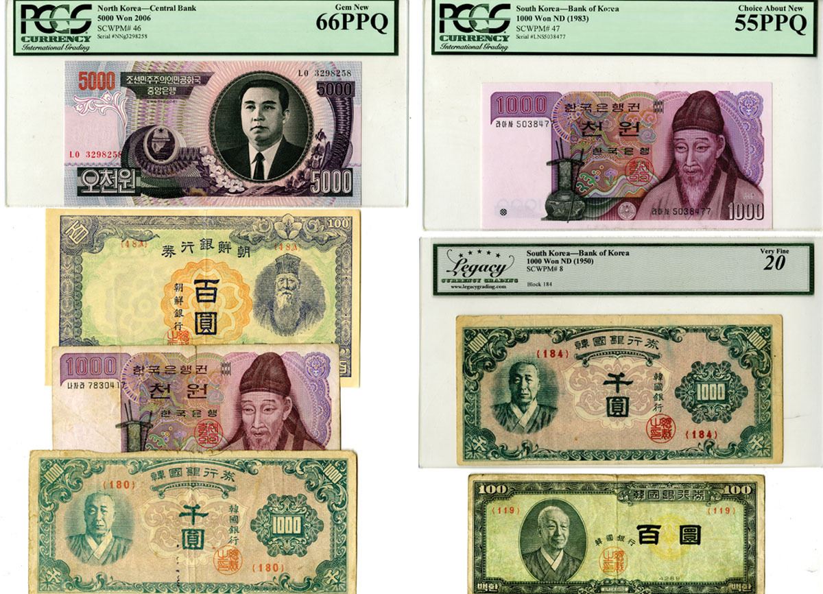 North & South Korea, ND (1947)-2006. Lot of 7 Issued Banknotes, Includes: Bank of Korea 1000 Won, P-8, LCG graded Very Fine 20 with comments "small edge split at bottom left;" 1000 Won, P-8, Fine; 100 Hwan, P-19c, VF; 1000 Won, P-47, PCGS graded Choice About New 55PPQ; 1000 Won, P-47, Fine; Bank of Chosen 100 Yen=100 Won, P-46b, ND (1947), VF-XF; North Korea Central Bank 5000 Won, P-46, PCGS graded Gem New 66 PPQ. (7). Sold "AS IS" no returns accepted.