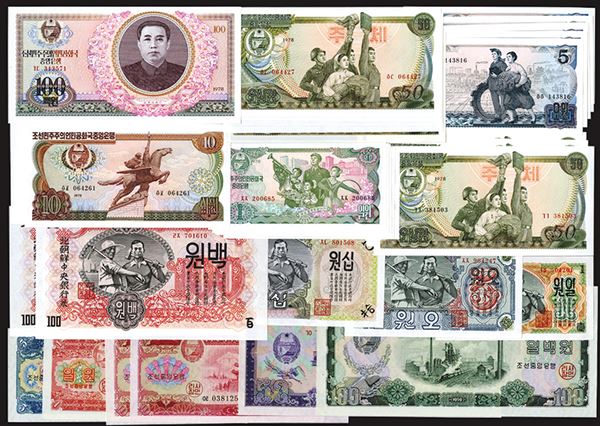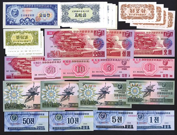 North Korea. 1 Chon thru 50 Won. 1947: P-5 (2); 6 (4); 7 (7) 8, 9, 10a, 11 (2), ; 1959: 12, 13, 14, 15 (2), 16, 17; 1978 Issue: 18a-e-21a-e, 22a plus additional 21a (4); 1988 Capitalist and Socialist Visitor Issues: P-23-38. All Crisp Uncirculated. 66 pieces.