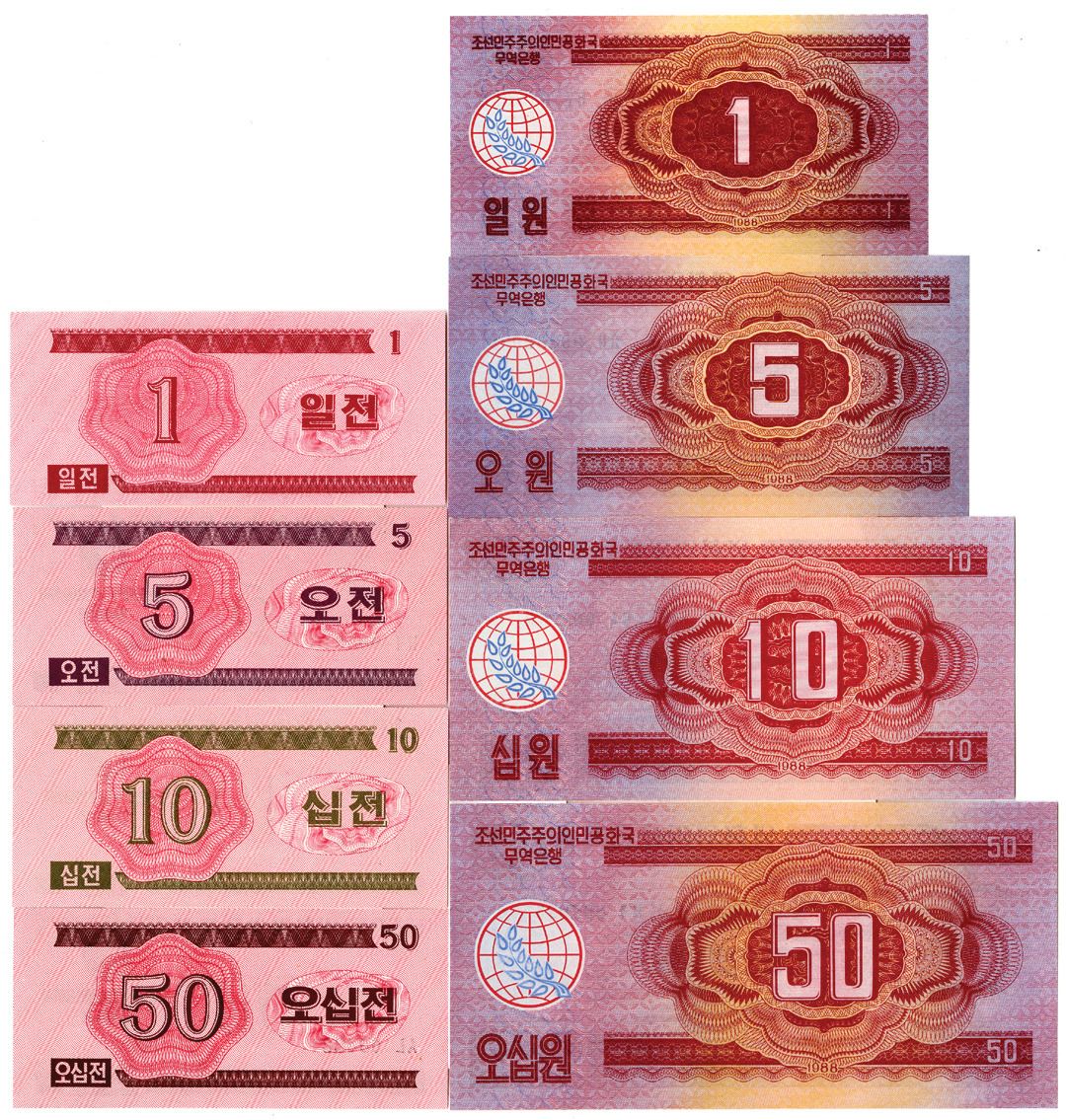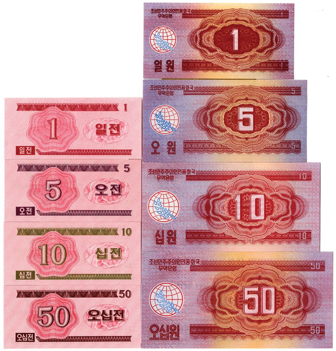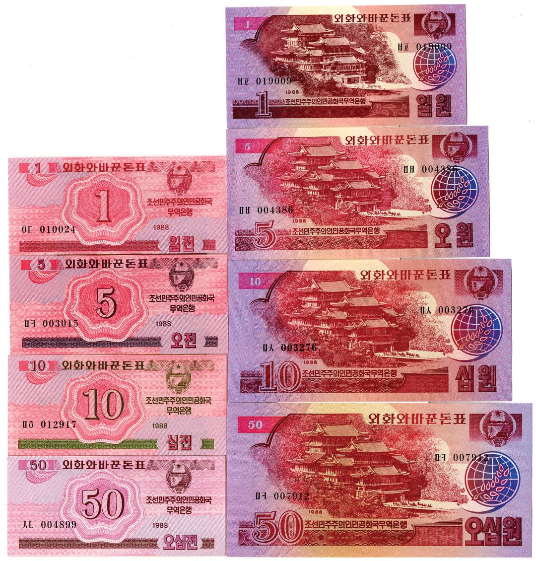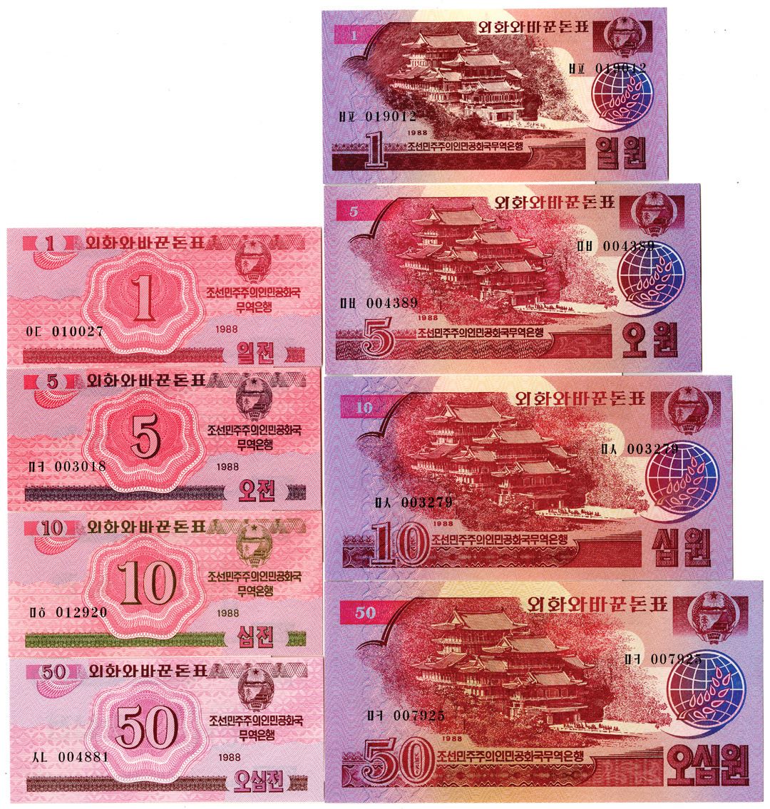 North Korea. 1988. 24 pieces: 1 Chon, P-31 (3); 5 Chon, P-32 (3); 10 Chon, P-33 (3); 50 Chon, P-34 (3); 1 Won, P-35 (3); 5 Won, P-36 (3); 10 Won, P-37 (3); and 50 Won, P-38 (3). All are in Uncirculated condition. 3 Full sets of 1988 Issue notes. (24)