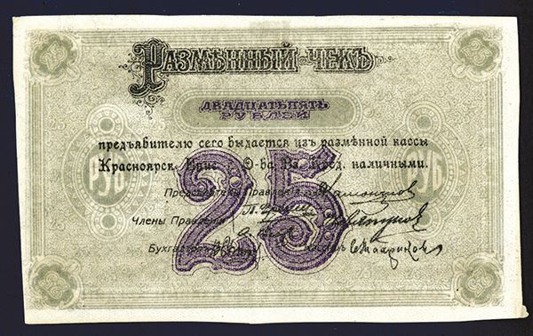 Russia, Krasnoyarsk, 25 Rubles, P-S970a, 1919, black on purple and gray underprint, without series letter. AU.