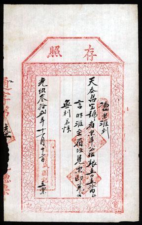 Kuang Hsu. 1906. Issued banknote. Note is 185 by 300 mm's. Red on off white paper. The note is in VF to XF condition with a small tear on the left side margin. Rare and early Chinese Private bank note.