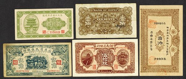China.10, 20, 50 Cents; 50 Coppers, 1 Yuan. P-S1362; S1682b; S1711d; S2740; S3948 (possible counterfeit). Very Fine or a bit better. 5 pieces.