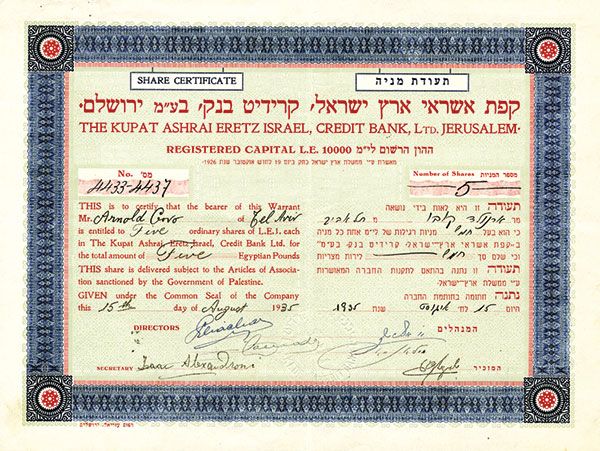 Jerusalem. 1935. 5 Shares I/U Stock. #4433-4437. Red print with blue/red border and green underprint. No vignette. VF condition.