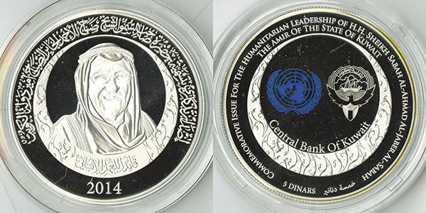 5 Dinars, 2014, Silver, Humanitarian Leadership of Sheikh Sabah, gem proof, original case & COA.