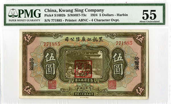 China. Harbin issued 5 Dollars, 1924, P-S1602b, S/M#H7-73c, PMG graded About Uncirculated 55 with comment "ink stamps". ABNC.