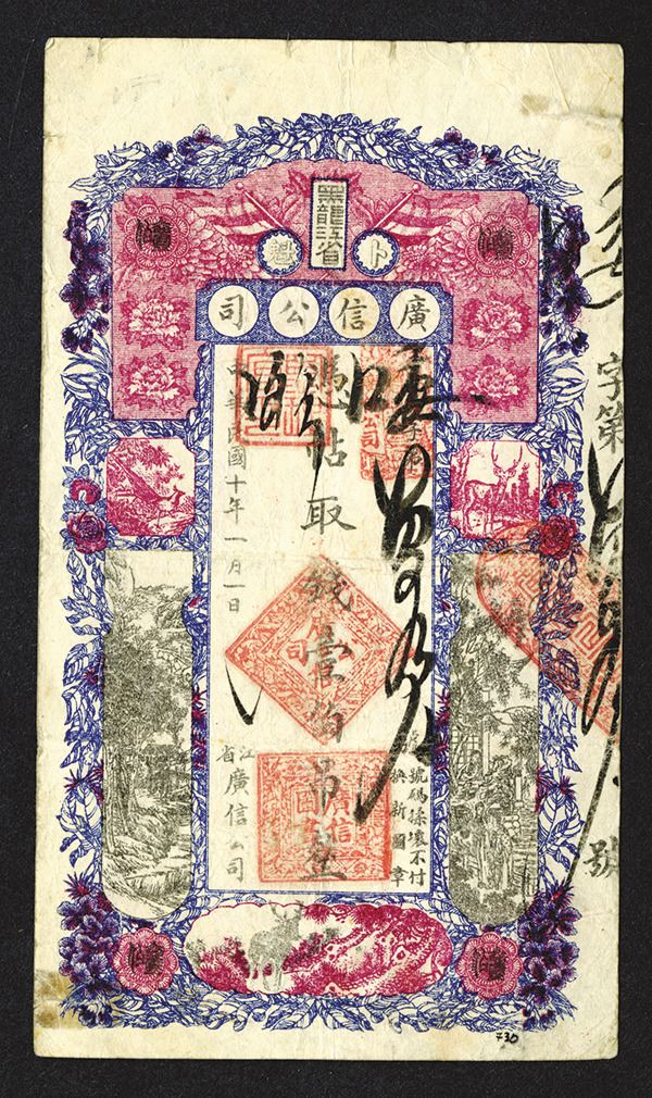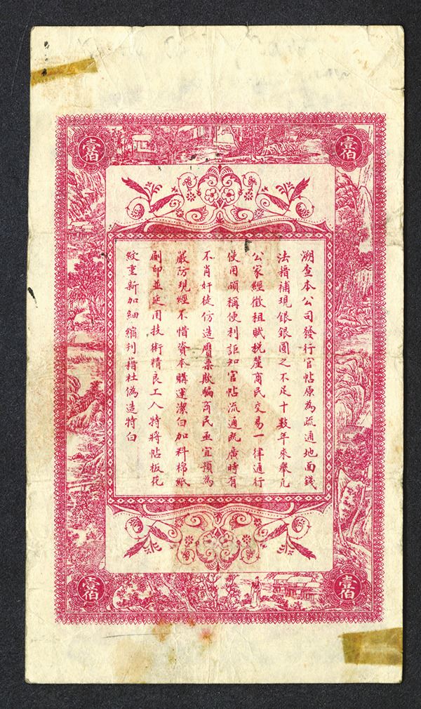 China. 100 Tiao. P-S1583. S/M H7-46. Wonderful border prints, flags at top. Also distinctive brush text. Two old tape repairs on back, now yellowing. Fine-Very Fine.