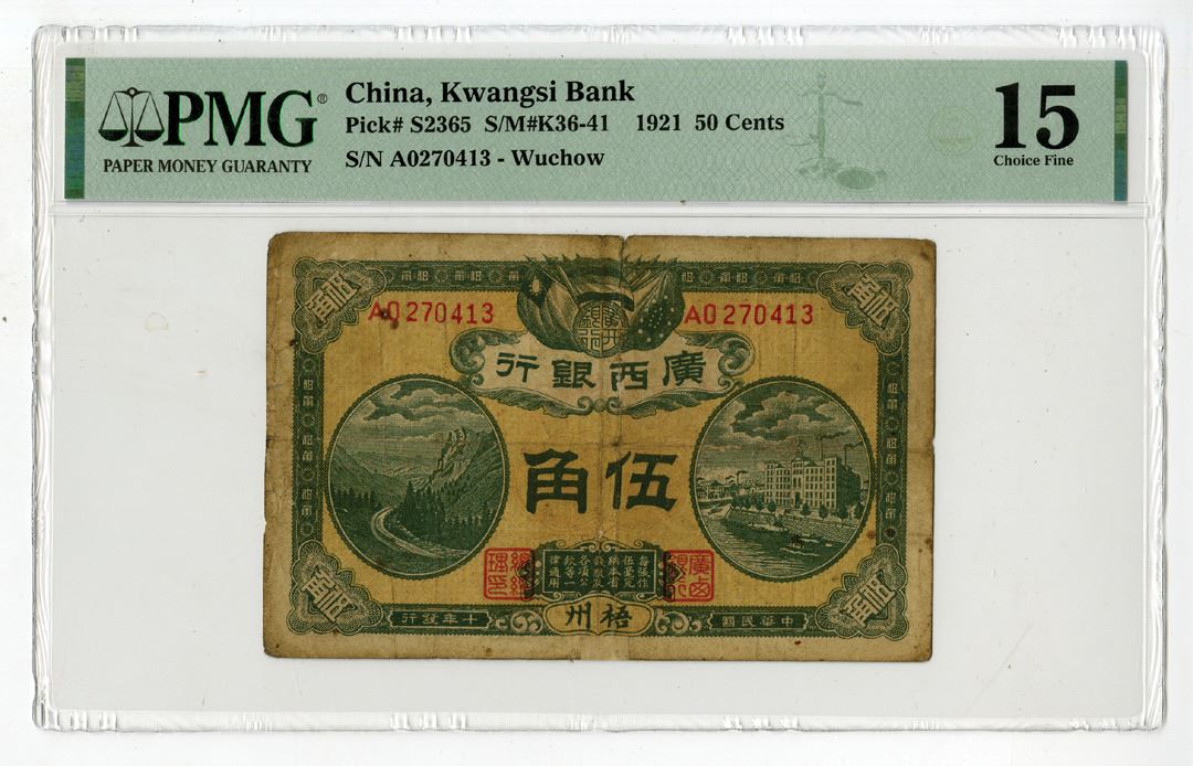 China, 1921. 50 Cents, P-S2365 S/M#K36-41, "Wuchow" Branch Issued Banknote, Deep blue-green on orange underprint, Circular frames with mountain pass at left and city buildings at right, Back is violet on pale green with octagonal stamp at center, S/N A0270413, PMG graded Choice Fine 15 with comment "Previously Mounted."