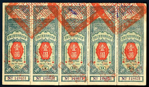 Issued, #'s 6 to 10, Vertical, green with red overprints, back orange, perforated between, AU to Uncirculated condition.