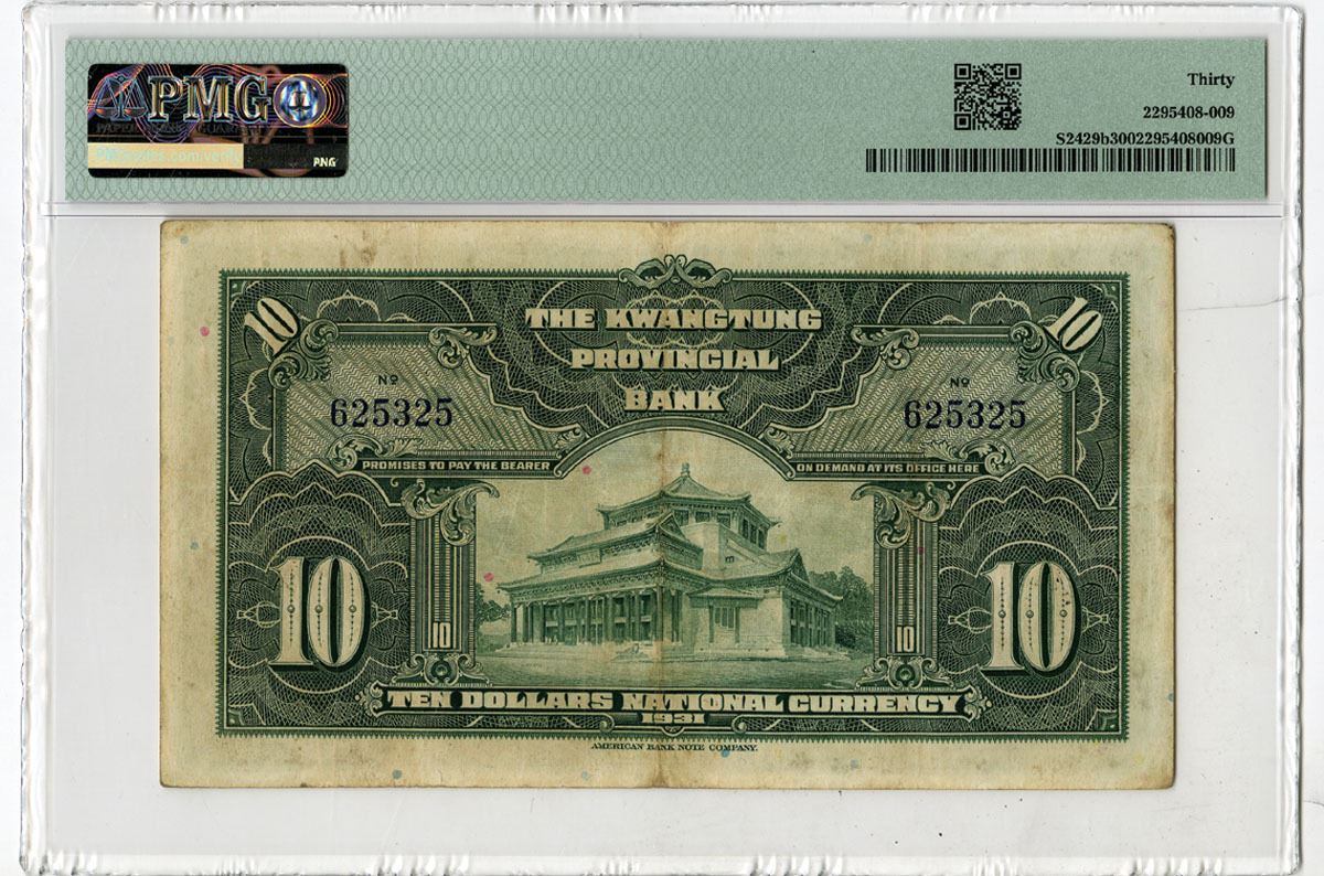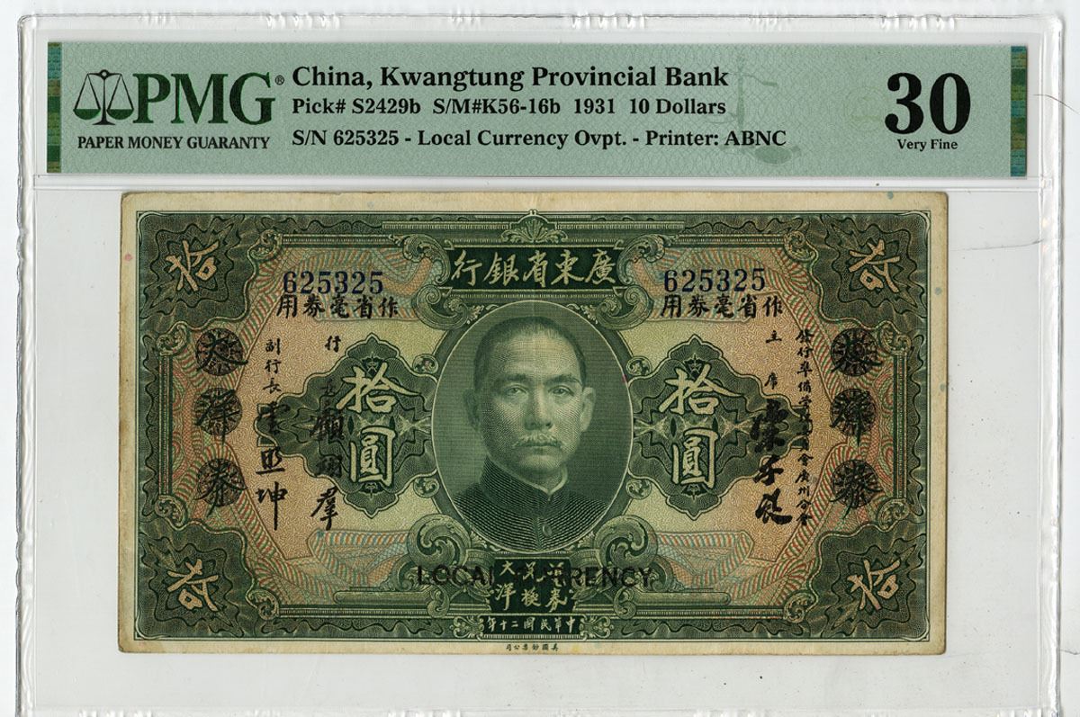 China, 1931. 10 Dollars, P-S2429b S/M#K56-16b, Issued Banknote, Green and m/c printing with SUS at center, Back is green with building at bottom center, Local currency overprint, S/N 625325, PMG graded Very Fine 30, ABNC. Only 4 previous examples have been offered at auction since 2016 with no other previous record or appearance. A very attractive and under-appreciated banknote rarity.
