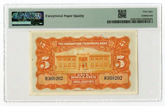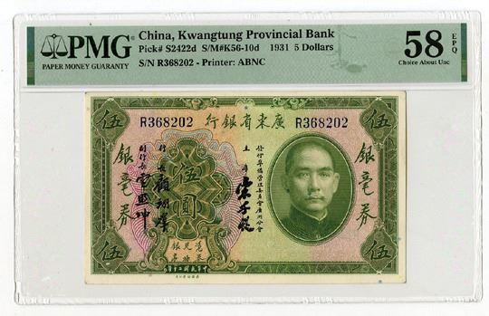 China, 1931. 5 Dollars, P-S2422d S/M#K56-10d, Issued Banknote, Green on m/c underprint with SYS at right, Back is orange, S/N R368202, PMG graded Choice About Uncirculated 58 EPQ, ABNC.