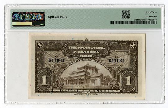 China, 1931. 1 Dollar, P-S2425b, S/M#K56-4b, Issued Banknote, Olive green and brown on m/c underprint with SYS at center, "Local Currency" overprint at bottom, Back is brown, S/N 611964, PMG graded Choice Uncirculated 63 with comment "Spindle Hole," ABNC.