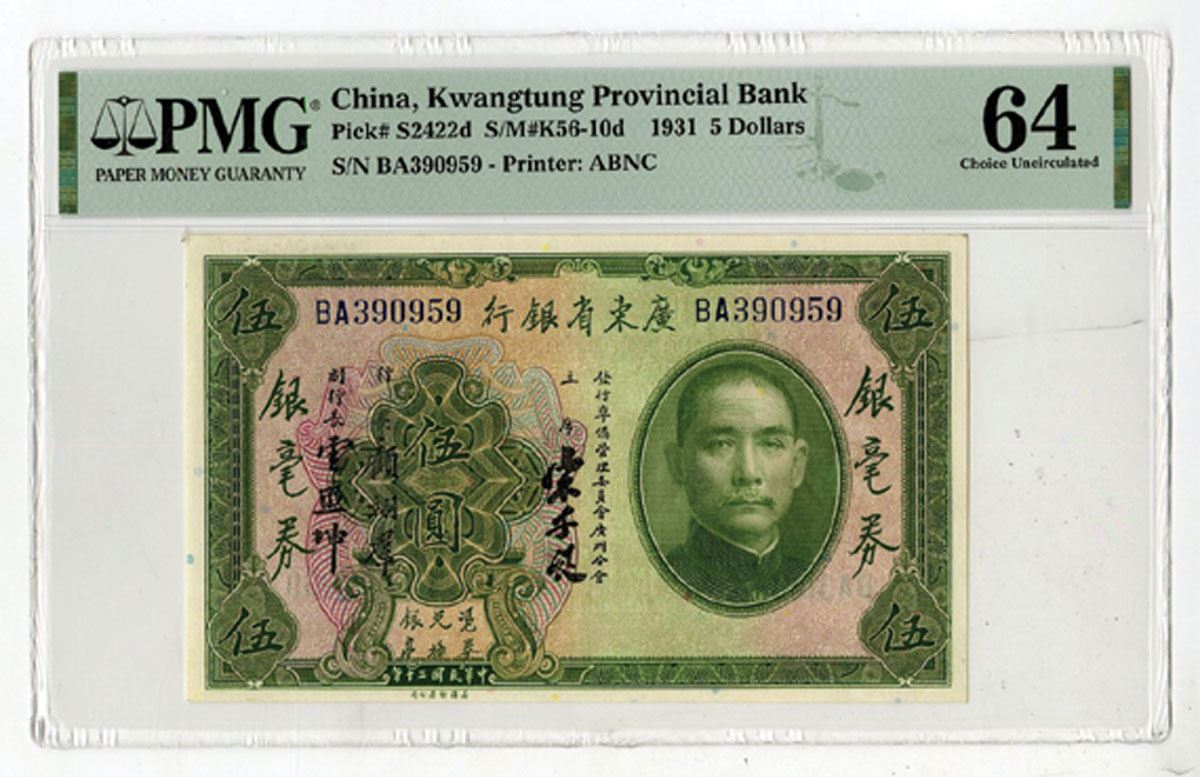 China, 1931. 5 Dollars, P-S2422d S/M#K56-10d, Issued Banknote, Green on m/c underprint with portrait of SYS at right, S/N BA390959, PMG graded Choice Uncirculated 64, ABNC