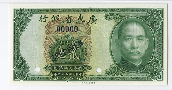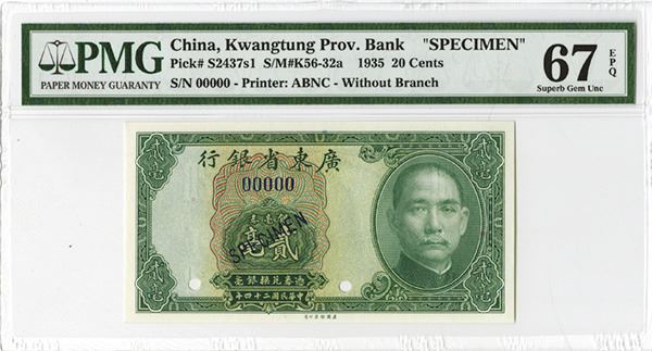 China, 1935, 20 cents, P-S2437s1, S/M#K56-32a, Specimen, Green on m/c, SYS at right, without signature or place name, back green with junks, PMG graded Superb Gem Uncirculated 67 EPQ, Rare Specimen in high grade, ABNC.