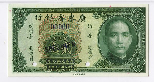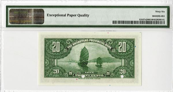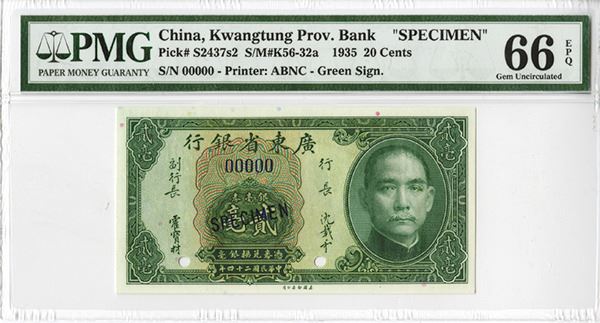 China, 1935, 20 cents, P-S2437s2, S/M#K56-32a, Specimen, Green on m/c, SYS at right, Green signature, back green with junks, PMG graded Gem Uncirculated 66 EPQ, Rare Specimen in high grade, ABNC.