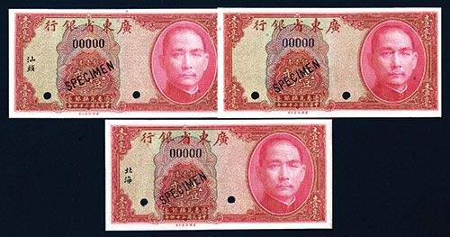 Lot of 3 notes, Includes Swatow, Pak Hoi and No Place Name locations, All 1935, 10 cents, P-S2436s1; s2 and s3, (S/M #K56-30-), , All Red on m/c with SYS at right, All with black specimen overprints, POC's, Uncirculated to Gem Uncirculated condition. ABNC.