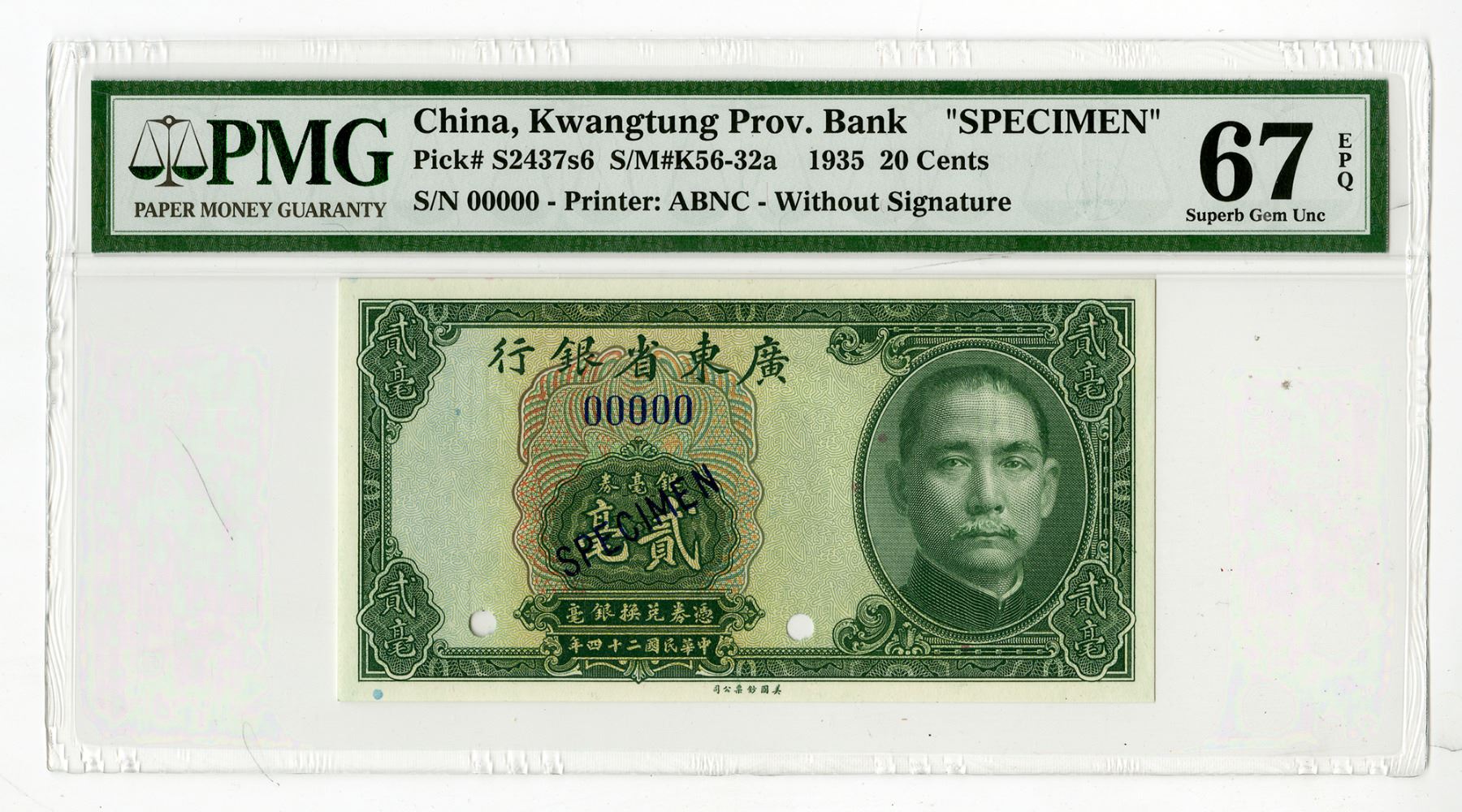 China. 1935, 20 cts, P-S2437s6, (S/M #K56-32a), Specimen, Without Signature, Green on m/c with SYS at right, Specimen overprint, POC and S/N 00000, PMG graded Superb Gem Uncirculated 67 EPQ. ABNC.