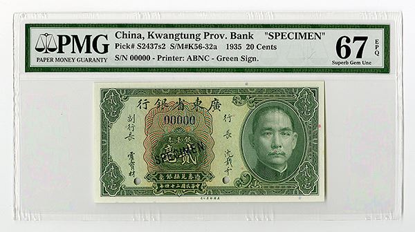 China. 1935, 20 cts, P-S2437s2, (S/M #K56-32a), Specimen, With green Signature, Green on m/c with SYS at right, Specimen overprint, POC, PMG graded Superb Gem Uncirculated 67 EPQ. ABNC.
