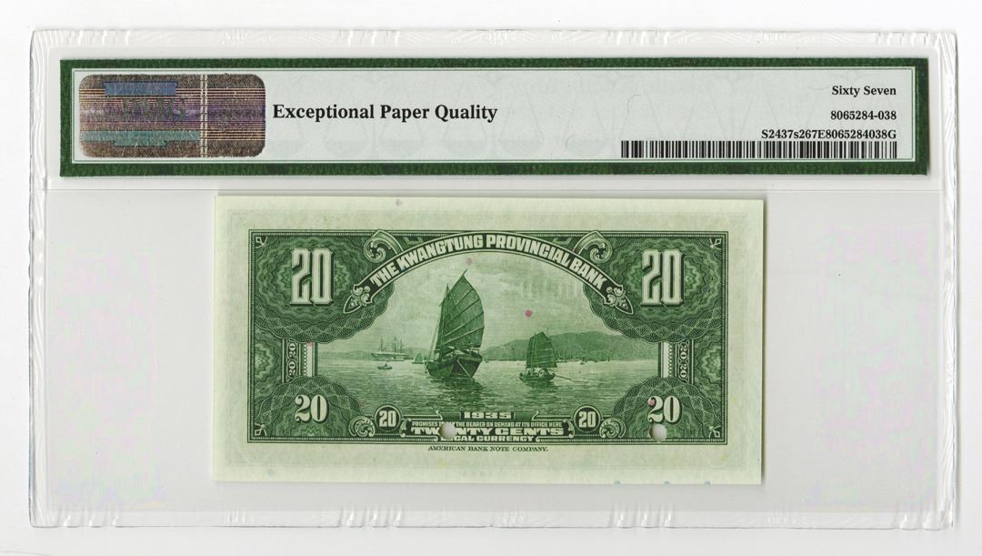 China. 1935, 20 cts, P-S2437s2, (S/M #K56-32a), Specimen, With green Signature, Green on m/c with SYS at right, Specimen overprint, POC, PMG graded Superb Gem Uncirculated 67 EPQ. ABNC.