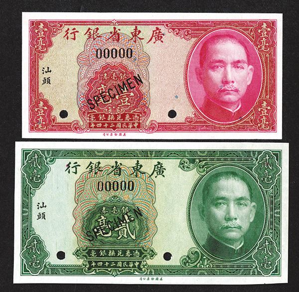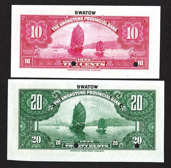 China, 1935, Lot of 2 notes, Includes 10 cents, P-S2436s3 and 20 cents P-S2437s4 , (S/M #K56-32) Specimens, both with SYS at right in green or red, Specimen overprints, POC's and S/N 00000, Both notes are in Choice to Gem Uncirculated condition. ABNC.