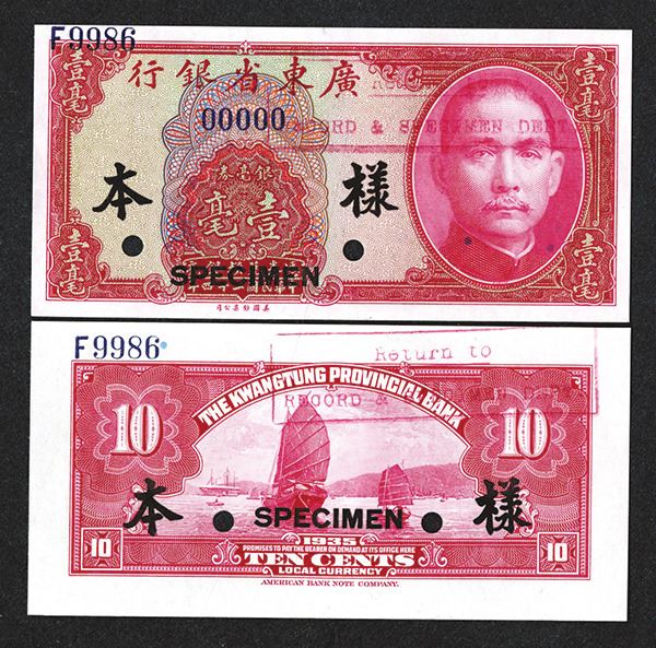 China, 1935, 10 cts, P-S2436s1, (S/M #K56-30a), Specimen, No place name, Both front and back are uniface with blank backs, Face is Red on m/c with SYS at right, POC and S/N 00000, Choice to Gem Uncirculated condition. ABNC.