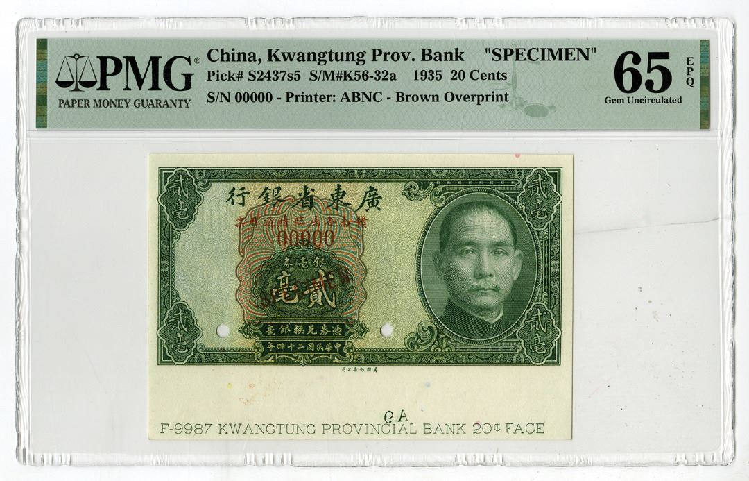 China, 1935. 20 Cents, P-S2437s5 S/M#K56-32a, Specimen Banknote, Green on m/c underprint with SYS at right, back green with junks on river, Small brown overprint under title on obverse. Specimen overprint and POCs, S/N 00000, PMG graded Gem Uncirculated 65 EPQ with comment "Selvage Included," ABNC. Rare military related banknote.