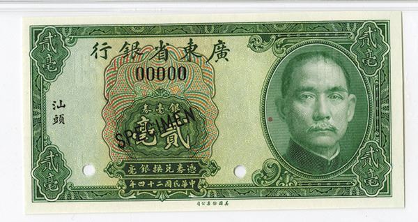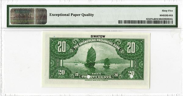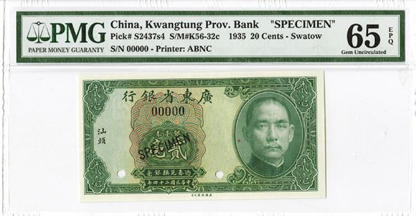 Swatow, China, 1935, 20 cents, P-S2437s4, S/M#K56-32c, Specimen, Green on m/c, SYS at right, back green with junks, PMG graded Gem Uncirculated 65 EPQ, Rare Specimen in high grade, ABNC.