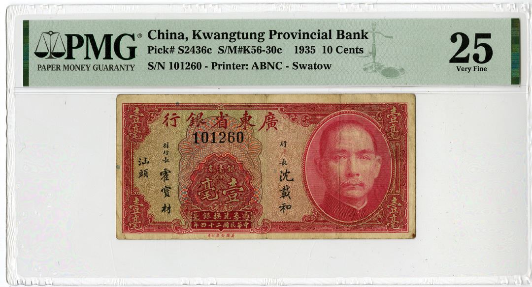 Swatow, China. 1935. 10 Cents, P-S2436c S/M#K56-30c, Issued banknote, Red on multicolor underprint, S/N 101260, PMG graded Very Fine 25. Printer: ABNC - Swatow. Only 3 issued examples graded including this example in the PMG census, all at the same grade, non higher. No issued example of this variety has been offered previously at auction. We have only offered specimens in the past, this is the first issued example we have had the pleasure to offer.
