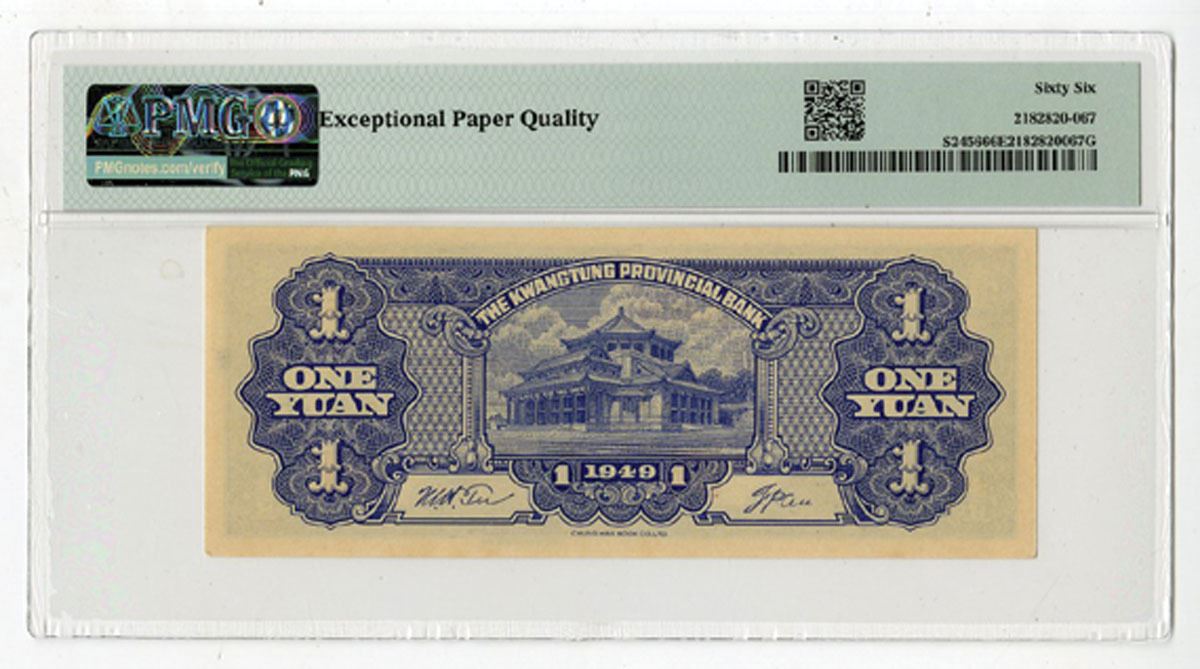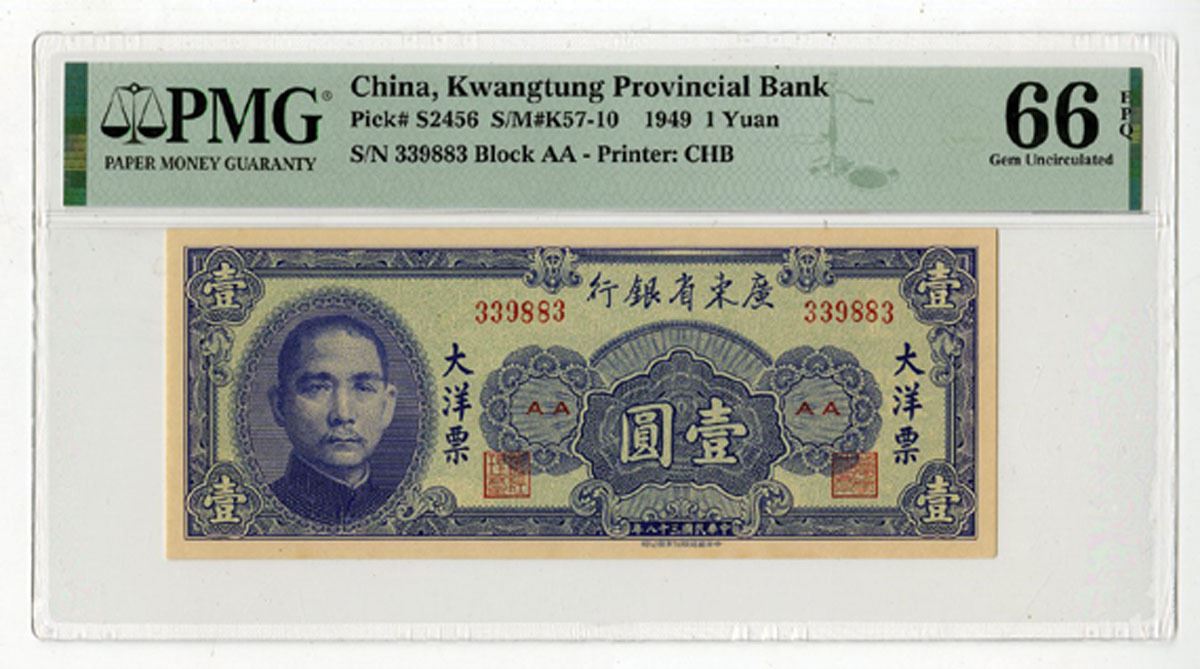 China, 1949. 1 Yuan, P-S2456, S/M#K57-10, Issued Banknote, Blue on green underprint with SYS at left, S/N 339883 Block AA, PMG graded Gem Uncirculated 65 EPQ, CHB.