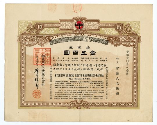 Japan, 1919. 10 Shares = 500 Yen, I/U Stock Certificate, Black on brown/maroon and olive border with brown underprint, Printed in Japanese and English, VF-XF condition. (ex. John E. Herzog Collection)