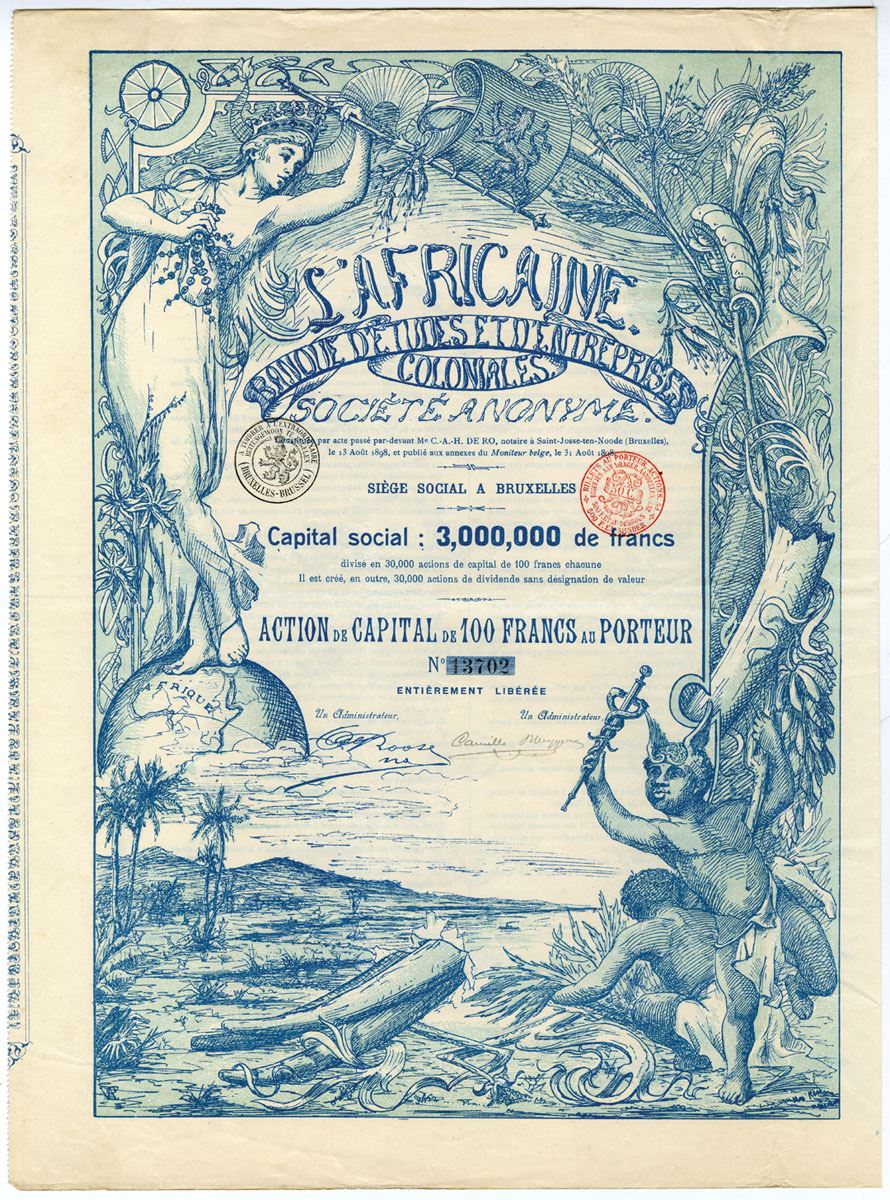Belgium and Africa, 1898. 100 Francs I/U Bond, Blue printing, border, and undertint, Ornate trees surrounding Allegorical woman holding flag and landscape along bottom of certificate. XF condition.