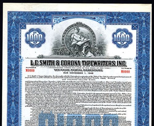 New York, 1940, $1000, 10 Year Serial Debenture Specimen Bond, Vertical format, Coupons attached, Black on blue border and underprint, Sitting allegorical woman top center, Red SPECIMEN overprints POC's and red s/n “ M0000” , VF condition with some wear around the edges, SBNC.
