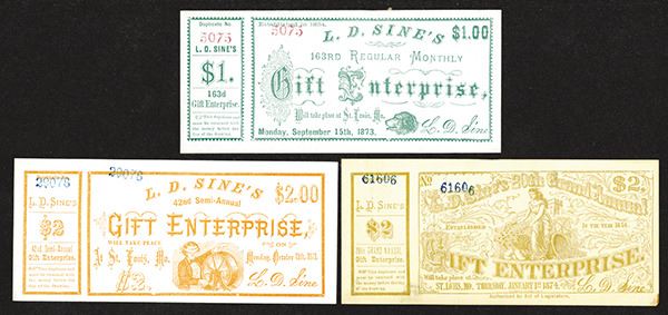 St. Louis, MO., Lot of 3 lottery tickets, all are L.D. Sines issued tickets, Includes 1873, $1, Green, 163rd Regular Monthly Gift Enterprise; 1873, $2, orange-brown, 42nd Semi-Annual Gift Enterprise with blind folded man reaching into lottery basket; and 1874, $2, 20th Grand Annual Gift Enterprise in gold foil ink with blind folded allegorical woman with cornucopia. All are in AU to Uncirculated with one with a dark stain on the lower right corner tip. Scarce St. Louis lottery tickets.
