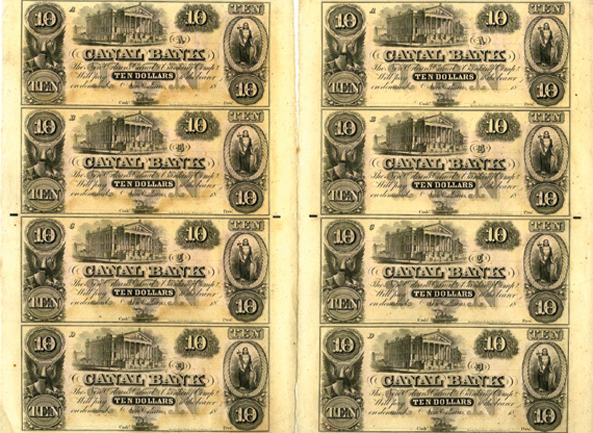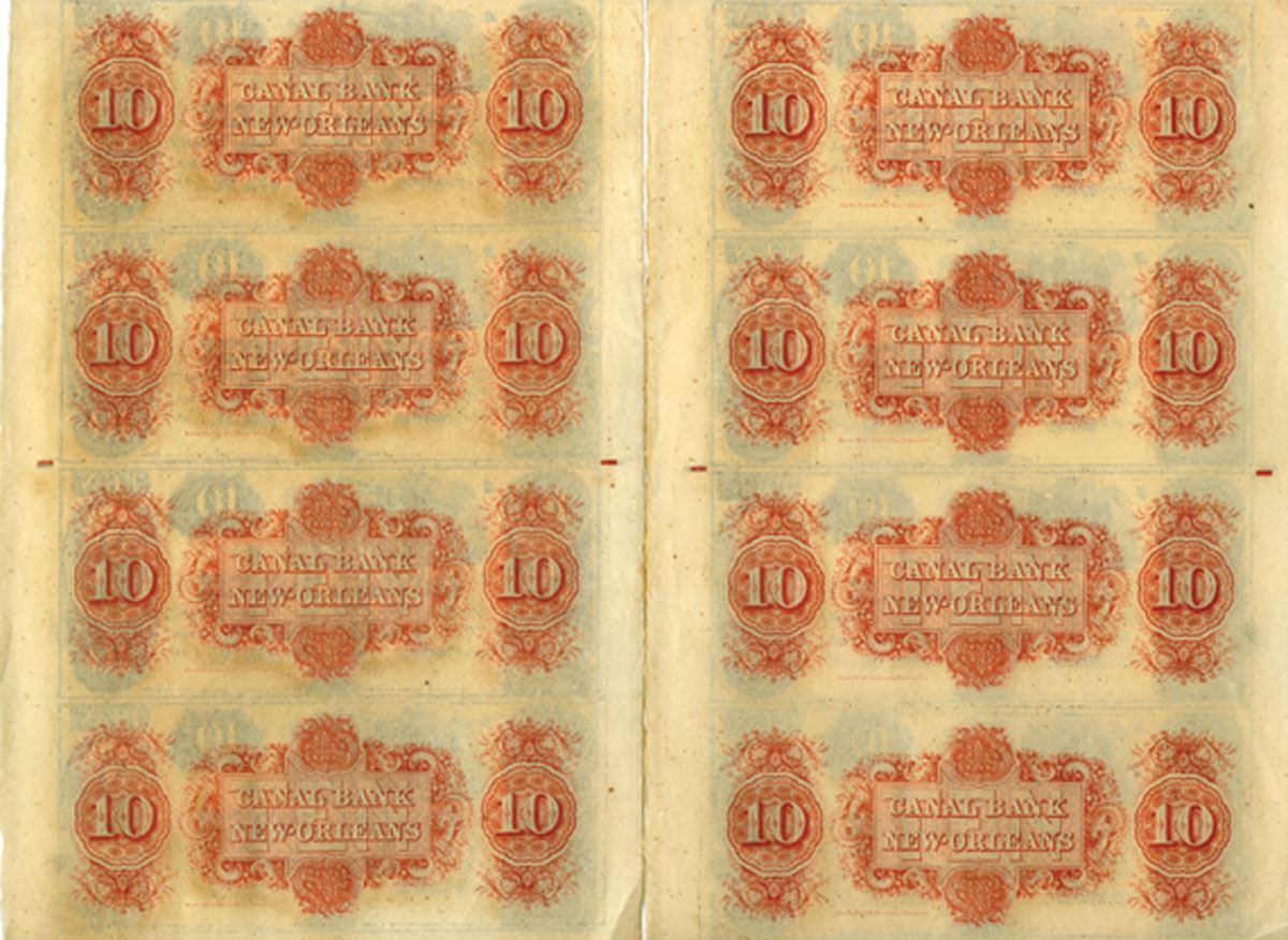 New Orleans, Louisiana, ND (1840-50s). Lot of 2 Uncut Sheet of 4, $10 Banknotes (8 obsolete notes if sheets are cut), Black printing with bank building at top and illustrations at left and right, Back is red, VF to AU condition. RWH&E, N. Orleans. (2).