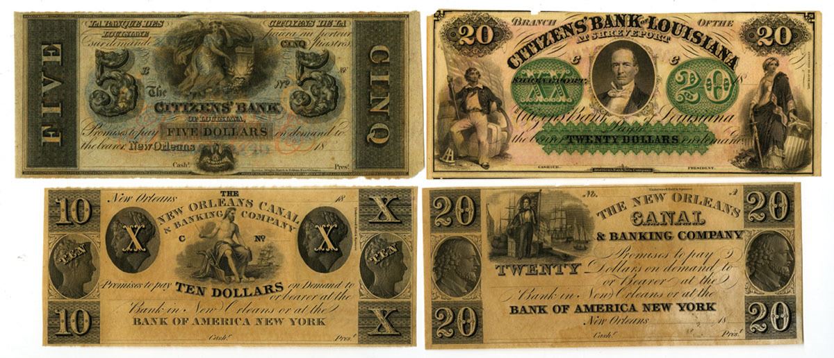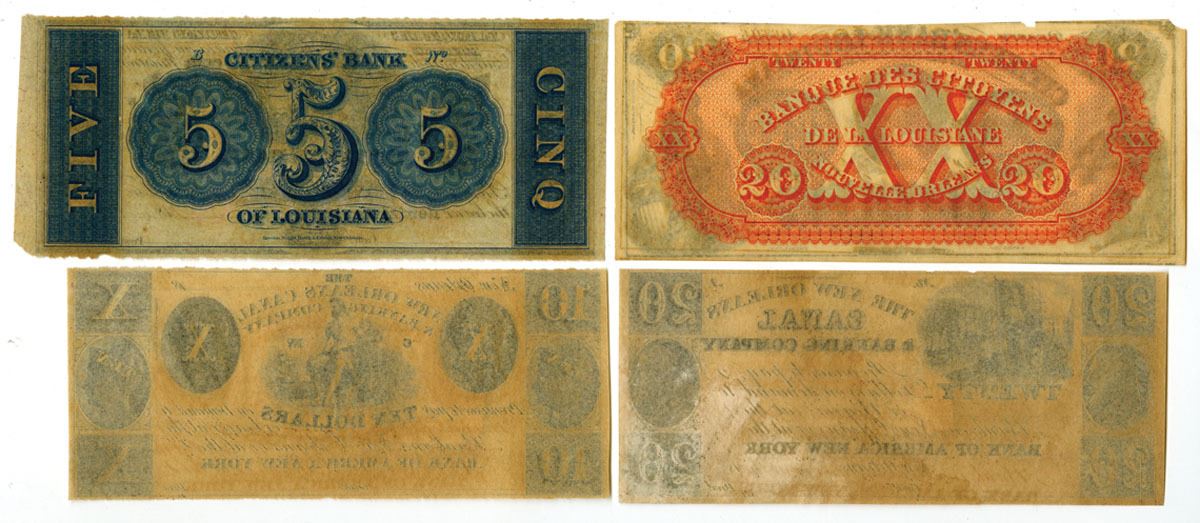 Louisiana, ca. 1850-70s. Lot of 4 Unissued Banknotes, including: New Orleans Canal & Banking Co. $10 U/U Banknote, Black print with Allegorical man at center; New Orleans Canal & Banking Co. $20 U/U Banknote, Black print with sailor at top left; Citizens' Bank of Louisiana $5 U/U Banknote, Black print with Allegorical woman and shield at top center, Rawdon, Wright, Hatch & Edson; and Citizens' Bank of Louisiana at Shreveport $20 U/U Banknote, Black print with green underprint, Portrait of a man at center, ABNC. Mostly AU to Uncirculated. (4) Very attractive group of notes.