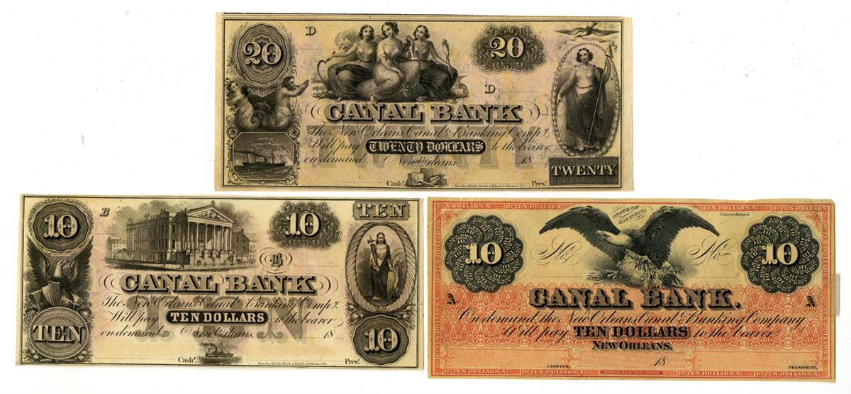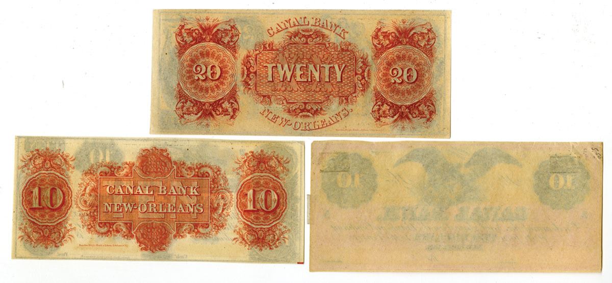 Louisiana, ca. 1850-70s. Lot of 3 Unissued Banknotes, all from the New Orleans Canal & Banking Co.: $10 U/U Banknote, Black print with red underprint, Eagle at top center, NBN; $10 U/U Banknote, Black print with large banking building at top, Red on back, Rawdon, Wright, Hatch & Edson; and $20 U/U Banknote, Black print with Trio of Allegorical women at top, Red on back, Rawdon, Wright, Hatch & Edson. All are in Choice XF to Uncirculated condition. (3)