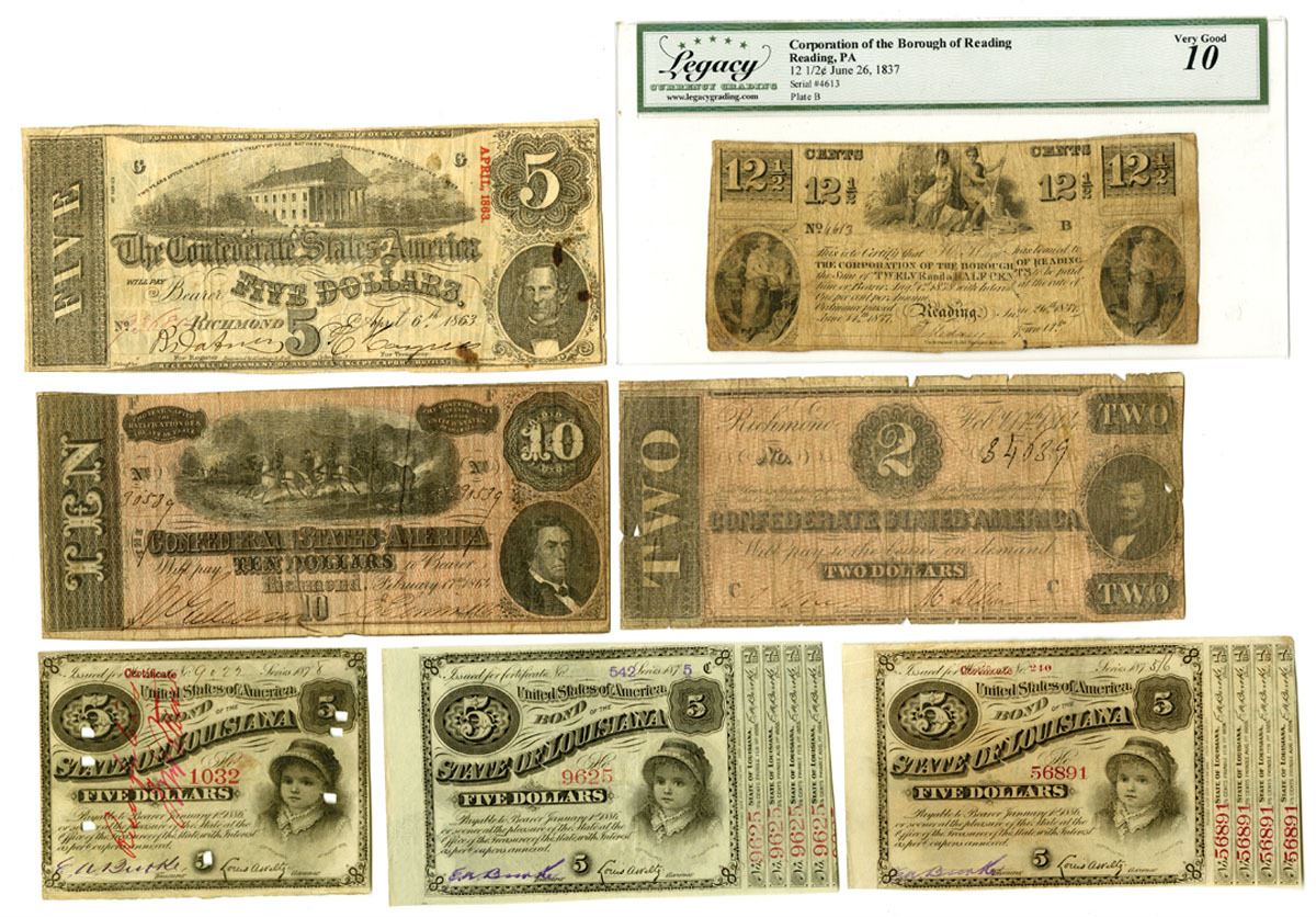 Louisiana, Pennsylvania & Virginia, 1837 to 1878. Lot of 6 Items, Includes: Louisiana, 1875 to 1878, Bond Trio: $5 I/U (2) and I/C (1) Bonds, Black printing with title at center and vignette of young woman at bottom right corner, one bond has cut-out cancels and writing across face, VF to XF condition (3); Reading, Pennsylvania, June 26, 1837, 12½ Cents I/U Obsolete Scrip Note, Black printing with multiple vignettes, Back features poem from newspaper titled "Rag Money", S/N 4613 pp B, Legacy graded Very Good 10 with comment "Tears; Backed with Contemporary Newspaper," UBS&H (1); Richmond, Virginia, 1863, $5, P-59b T-60 SL#60, Black printing with Capitol at Richmond at top center and portrait of C. G. Memminger at right, Back is blue with denomination repeated five times, First Series S/N 93685 pp G, Good to Fine, Engraved by Keating & Ball, Lithographed by J.T. Paterson (1); Richmond, Virginia, 1864, $2, P-66a T-70 SL#67, Uniface Note, Black on red underprint with portrait of J. P. Benjamin at right, S/N 34639 pp C, Good to Fine+, Engraved by Keatinge & Ball (1); $10, P-68 T-68 SL#69, Black on red underprint with artillery horseman pulling cannon at center and portrait of M.T. Hunter at lower right, Back is blue with "TEN" printed at center and overprint reading "Childrey, The Druggist - Dealer in Old Coins, Stamps, Relics of the War, Richmond Virginia", S/N 30539 pp F, Fine to VF+, Keating & Ball (1). (6). Sold "AS IS" no returns accepted.