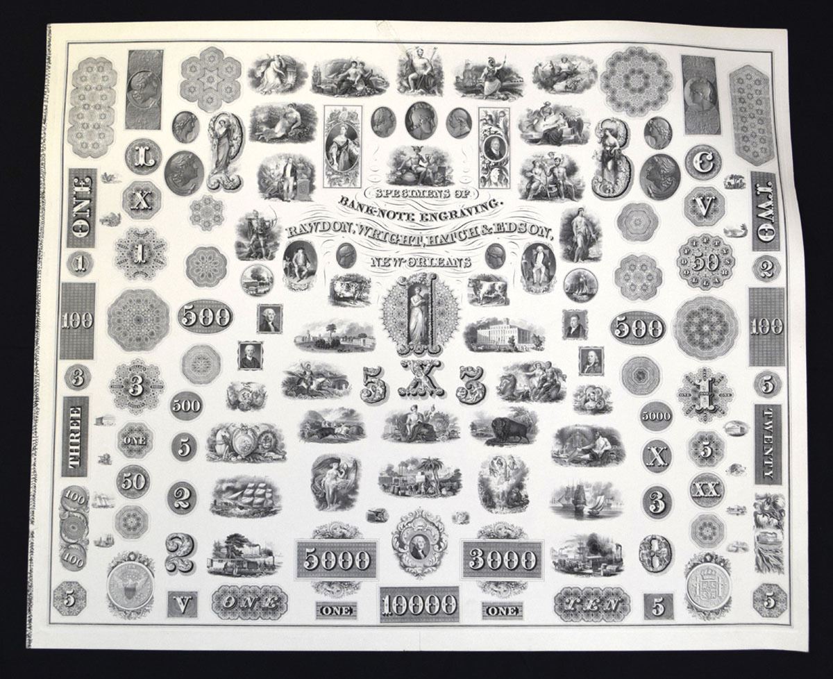 New Orleans, Louisiana, ND (1850-60s). Large engraved specimen sheet titled “Specimens of Bank Note Engraving” by Rawdon, Wright, Hatch & Edson, displaying an extensive array of vignettes, counters, medallions, and denomination dies used in banknote production. Includes allegorical figures, classical portraits, locomotives, ships, livestock, architectural scenes, and intricate geometric lathe work, along with denomination panels ranging from 1 to 10,000. A highly detailed advertising and reference sheet showcasing the engraver’s capabilities and design inventory. Condition ranges from AU condition. RWH&E, N.O.