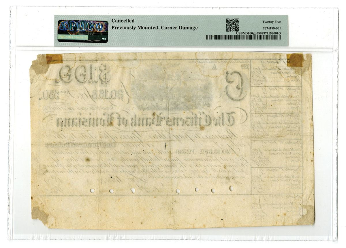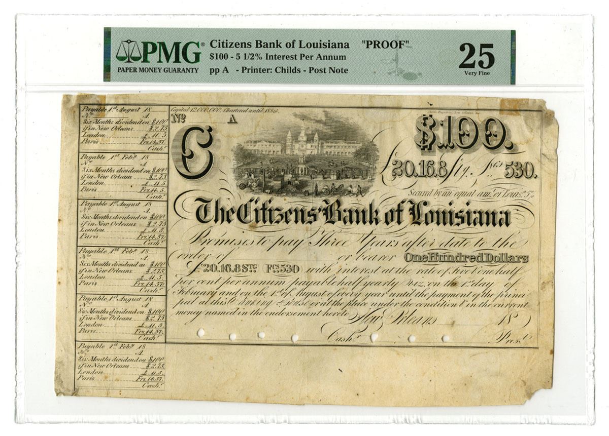 New Orleans. ND (1836-1839), Citizens' Bank of Louisiana, $100 = 530.0 Francs = £20.16.8 Stg, 5 1/2% Interest Per Annum, Proof Obsolete Interest Bearing Post Note, Black printing on india type of paper, 7 POCs, pp A, PMG graded Very Fine 25, 6 interest coupons on the left side, A highly attractive and historical proof note issued by the Citizens Bank of Louisiana in the mid-1830s. This unique proof features the intricate engraving of the bank's impressive headquarters building, showcasing the neoclassical architecture of the time, with people and horses in busy street scene in front, Large "C" on left and "100" at right , text states "The Citizens' Bank of Louisiana Promise to pay Three Years after date to the order of ______ or Bearer One Hundred Dollars........with interest at the rate of 5 1/2 per cent per annum payable half yearly.......", The Citizens Bank of Louisiana, a prominent institution in New Orleans during the early 19th century, played a critical role in financing both local and international trade, This is very possibly a discovery piece from this bank of a circulating and interest bearing Post Note, similar to the 1864 Interest Bearing Notes and Compound Interest Bearing notes issued by the United States during the Civil War. This and the following companion piece are from an old estate and have never appeared at auction previously, nor have any records of a previous auction appearance or sale of this design and type been found. "Childs, Engraver, New Orleans". Very possibly unique, First time seen by describer.