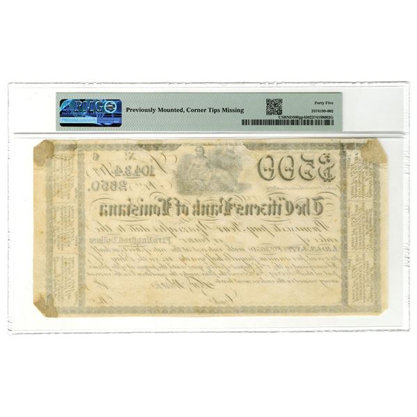 New Orleans. ND (1836-1839), Citizens' Bank of Louisiana, $500 = 2650 Francs = £104.3.4 Stg, 5 1/2% Interest Per Annum, Proof Obsolete Interest Bearing Post Note, Black printing on india type of paper, pp B, PMG graded Choice Extremely Fine 45 with note of "previously mounted and corner tips missing, 6 interest coupons, 3 on the left and 3 on the right side, A highly attractive and historical proof note issued by the Citizens Bank of Louisiana in the mid-1830s. This unique proof features the intricate engraving of a reclining partially nude Native American woman in middle, Large "$500" on left over title, text states "The Citizens' Bank of Louisiana Promise to pay Four Years after date to the order of ______ or Bearer Five Hundred Dollars........with interest at the rate of 5 1/2 per cent per annum payable half yearly.......", The Citizens Bank of Louisiana, a prominent institution in New Orleans during the early 19th century, played a critical role in financing both local and international trade, This is very possibly a discovery piece from this bank of a circulating and interest bearing Post Note, similar to the 1864 Interest Bearing Notes and Compound Interest Bearing notes issued by the United States during the Civil War. This and the previous companion piece are from an old estate and have never appeared at auction before, nor have any records of a previous auction appearance or sale of this design and type been found. "Childs, Engraver, New Orleans". Very possibly unique, First time seen by describer.
