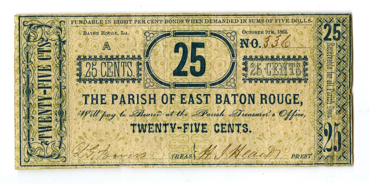Baton Rouge, LA. October 9, 1862. Parish of East Baton Rouge Fractional Currency Note, Twenty-Five Cents (25 Cents). Unlisted parish issue. Issued parish fractional currency note payable to bearer at the Parish Treasurer’s Office, denominated Twenty-Five Cents, with text stating the issue is fundable in eight percent bonds when demanded in sums of five dollars. Printed in blue and black ink on thin paper with ornate typographic borders, large central “25” denomination panel, multiple “25 Cents” counters, and vertical denomination tablets at the sides; the note bears a handwritten serial number 336 at upper right and manuscript signatures at the lower margin for the Treasurer and Parish President. The reverse shows faint ink bleed-through but is otherwise blank, as issued. The condition ranges from Choice Fine to VF condition or better, with typical circulation folds, light soiling, and age toning consistent with use. Printer not indicated on the note.