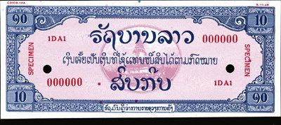1948. P-Unlisted. 10 Kip. Essay banknote for proposed issue. Temple undertint on front. Dark Blue & Light violet-pink; back has temple in red. Dated 3-10-48 in red on right and numbered C2003-10A in red on upper left. Rare. Unique in archive. SBNC.